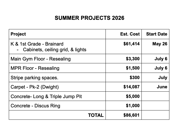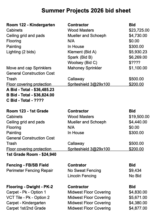 SUMMER WORK BID SHEET Superintendent Eldridge provided the school board with summer work bids for the 2026 summer work schedule. The board moved to accept the bids as presented while accepting the Klement Electric bid and the Midwest flooring bid for VCT tile in the Dwight Preschool classroom. MOTION PASSED: 5-0 (Kozisek - Aye, Pekarek - Aye, Strizek - Aye, Smaus - Aye, Spatz - Aye, Jisa - Absent) |